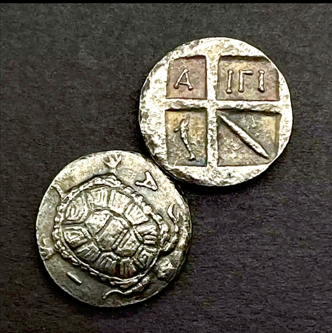 Aegina was the first city-state in Europe to mint its own coins, beginning in the 6th century B.C. The sea turtle symbolized Aegina's naval strength and Maritime Trade. Aegina was one of the first city-states in ancient Greece to mint its own coins, starting in the 6th century B.C.The sea turtle was replaced with a land tortoise on later coins to symbolize the loss of its sea power after Aegina was defeated by Athens in 458 B.C.