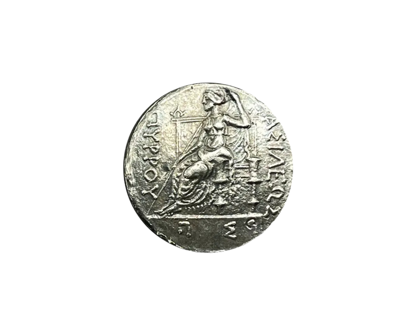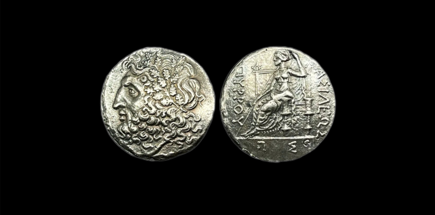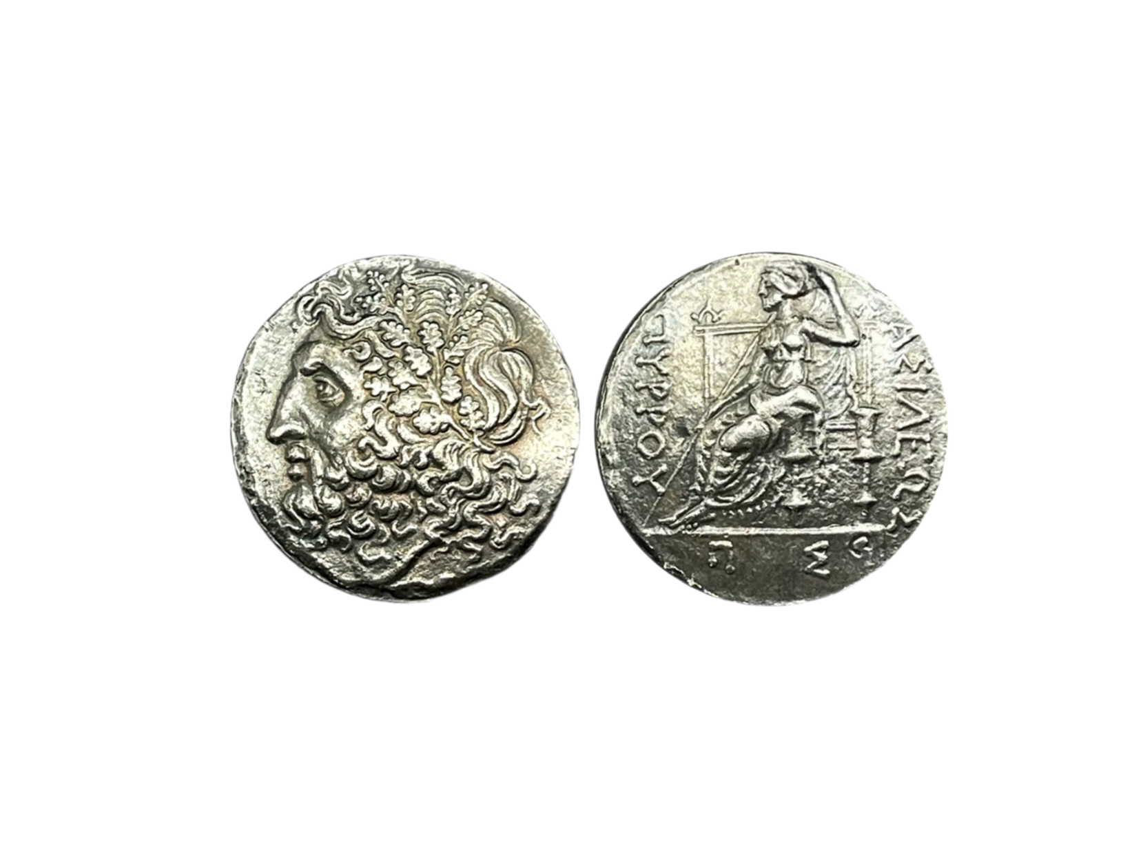Ancient Greek silver tetadrahm coin, depicting the head of Zeus, wearing a wreath of oak leaves. The reverse side depicts the goddess Dione seated on a throne.