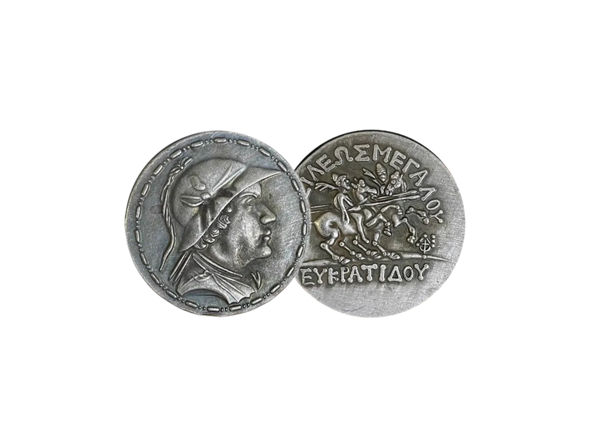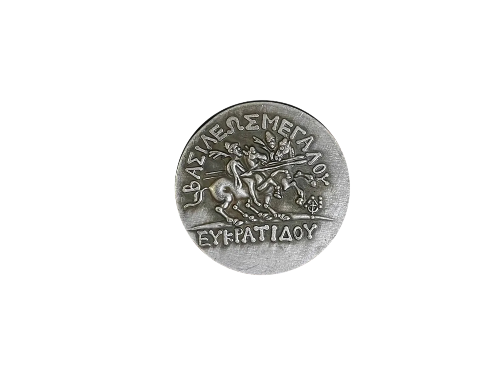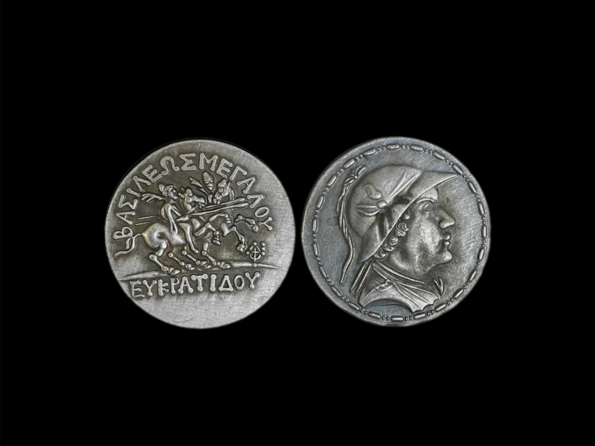 silver tetradrachm coin of the Greco-Bactrian king Eucratides I.