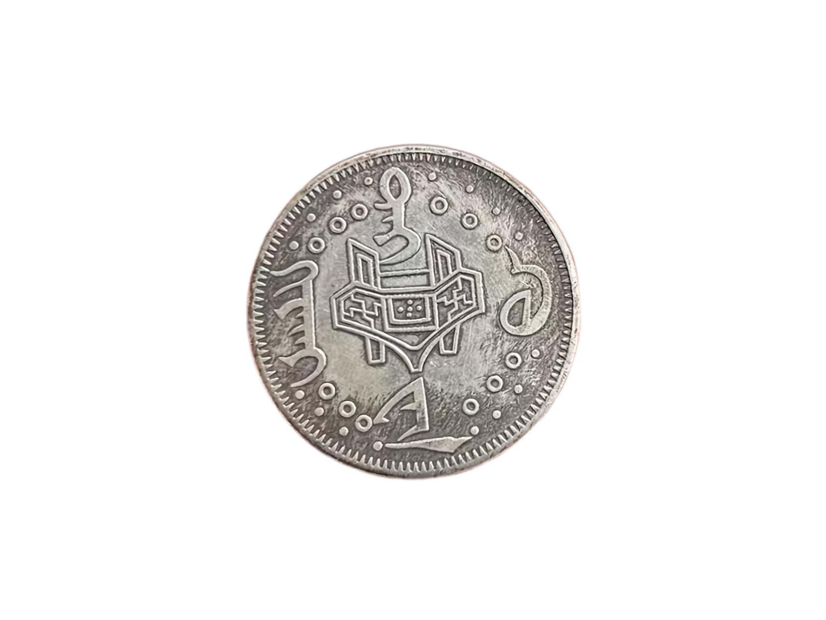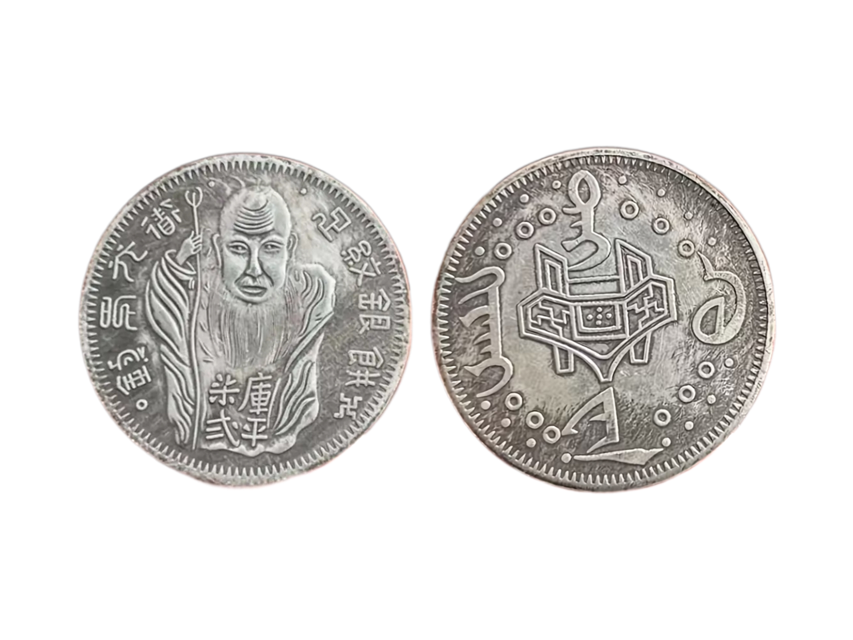 The silver coin or medal featuring the figure of the Chinese god of longevity, Shou Xing (or Sau), and Chinese text.