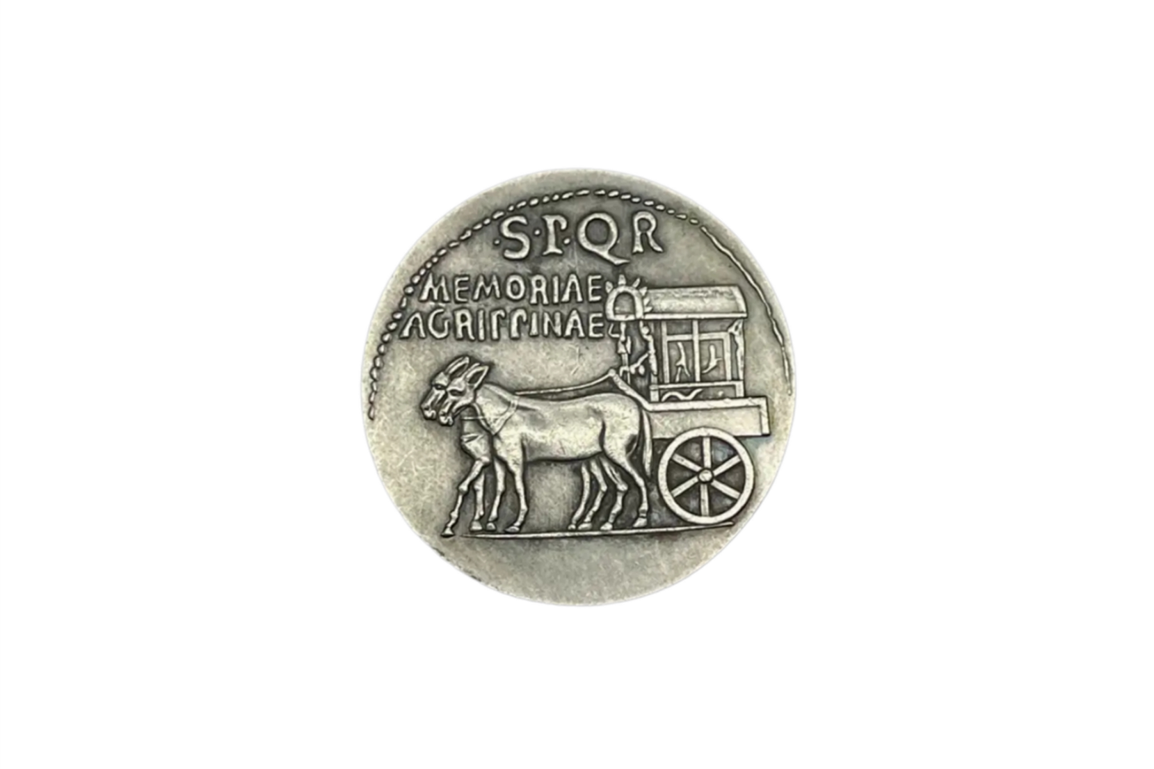 The reverse side shows a carpentum, a covered two-wheeled carriage, drawn by two mules, with the inscription "SPQR MEMORIAE AGRIPPINA".