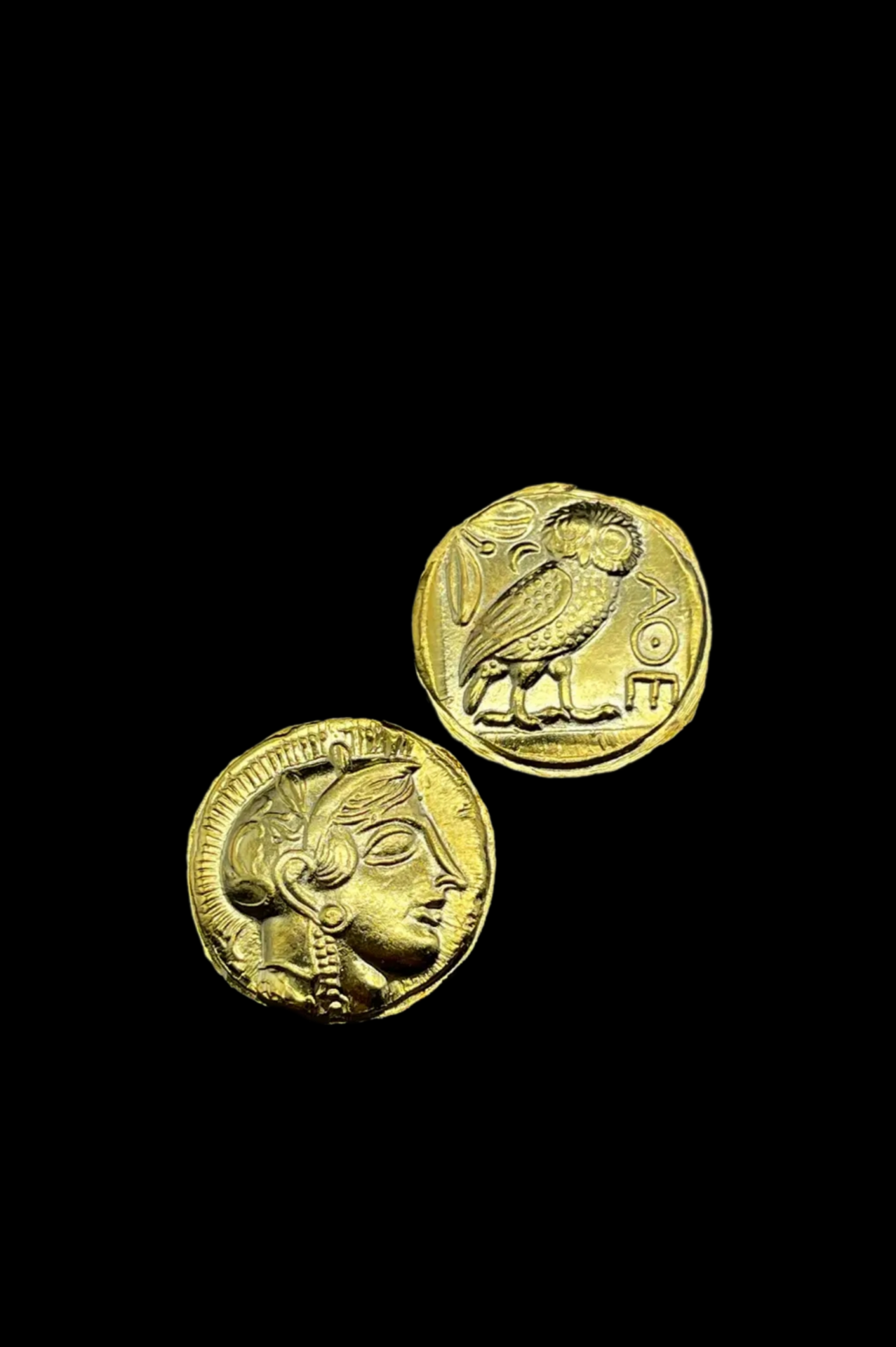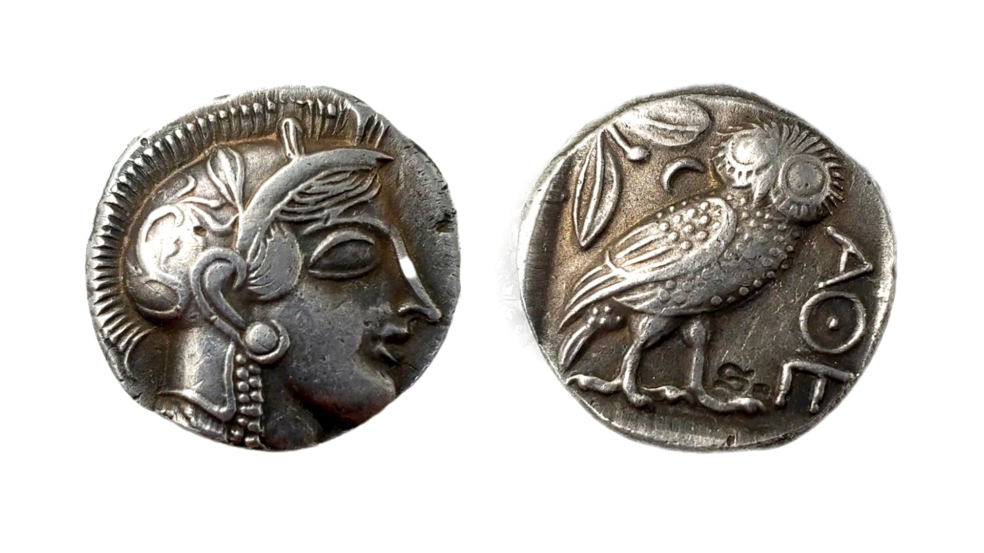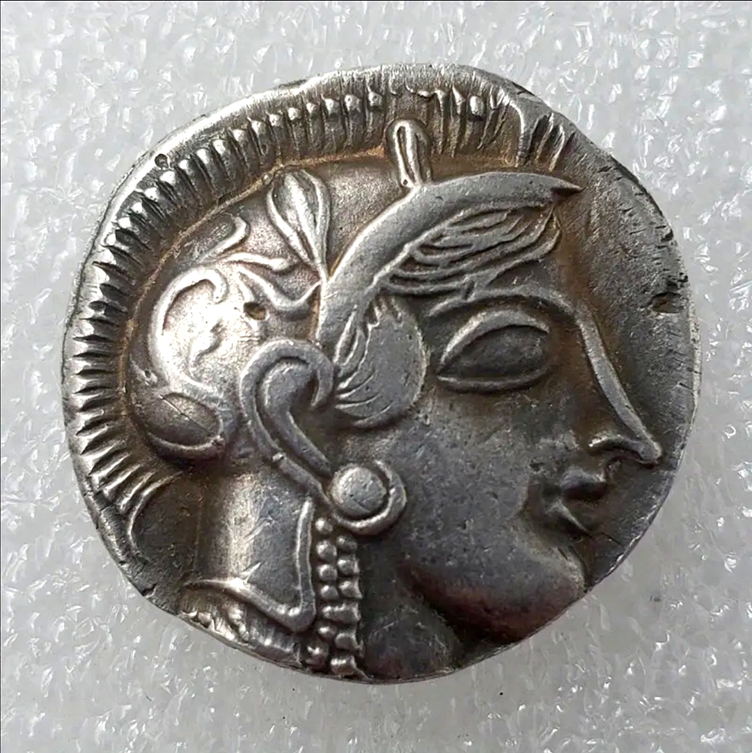 This coin is an ancient Athenian silver tetradrachm, a coin minted in Athens, Greece, from the 6th century BCE onward. The coin features the head of the goddess Athena on one side and her sacred owl on the other. The reverse side depicts an owl with an olive sprig and a crescent moon, along with the inscription "AΘE," an abbreviation for "of the Athenians". The tetradrachm became a widely accepted trade currency throughout the ancient world Due to the quality of the silver and Athens' political and military influence.