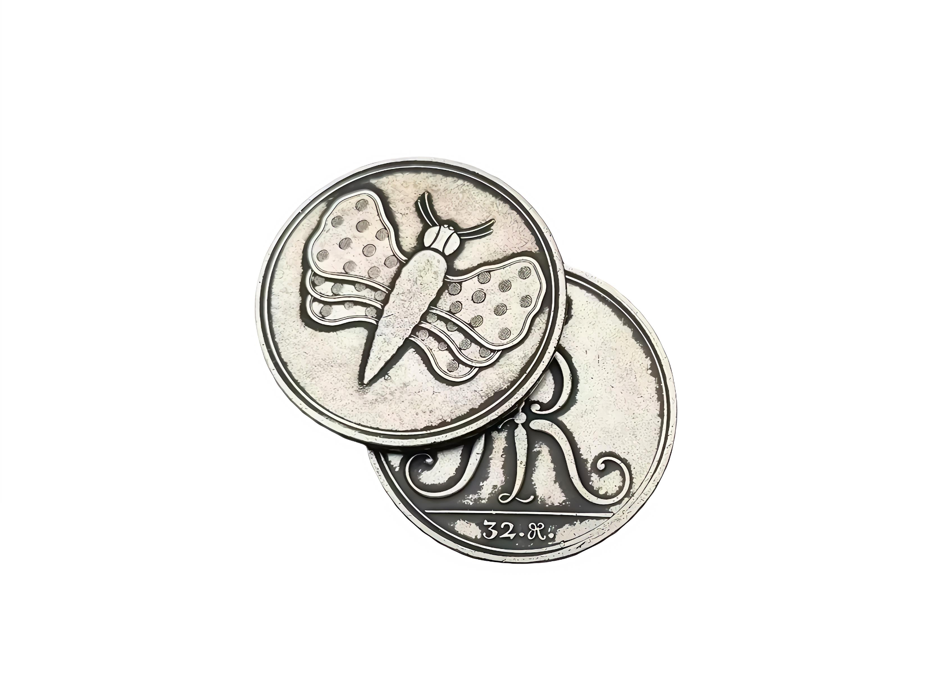 The butterfly motif is a symbolic design element that distinguishes this coin.