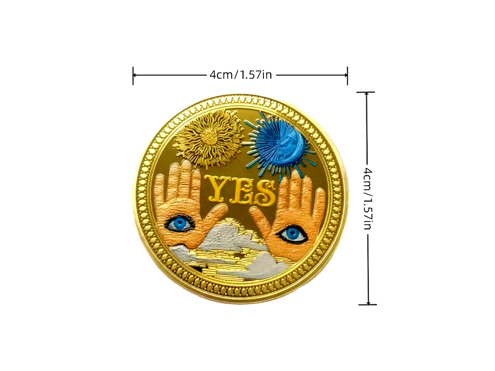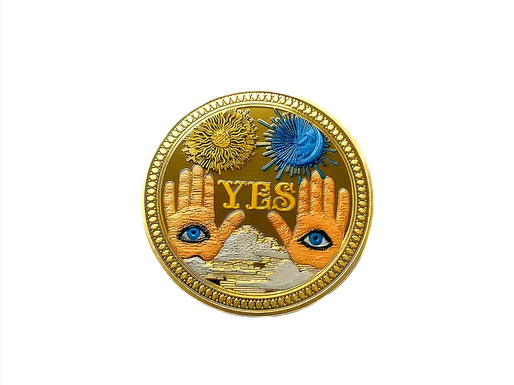 features hands with all-seeing eyes, a sun, and a moon, with the word "YES" prominently displayed - "YES," on one side and the other says "NO" on the other. This coin is used to help make quick decisions by flipping them like a traditional coin.