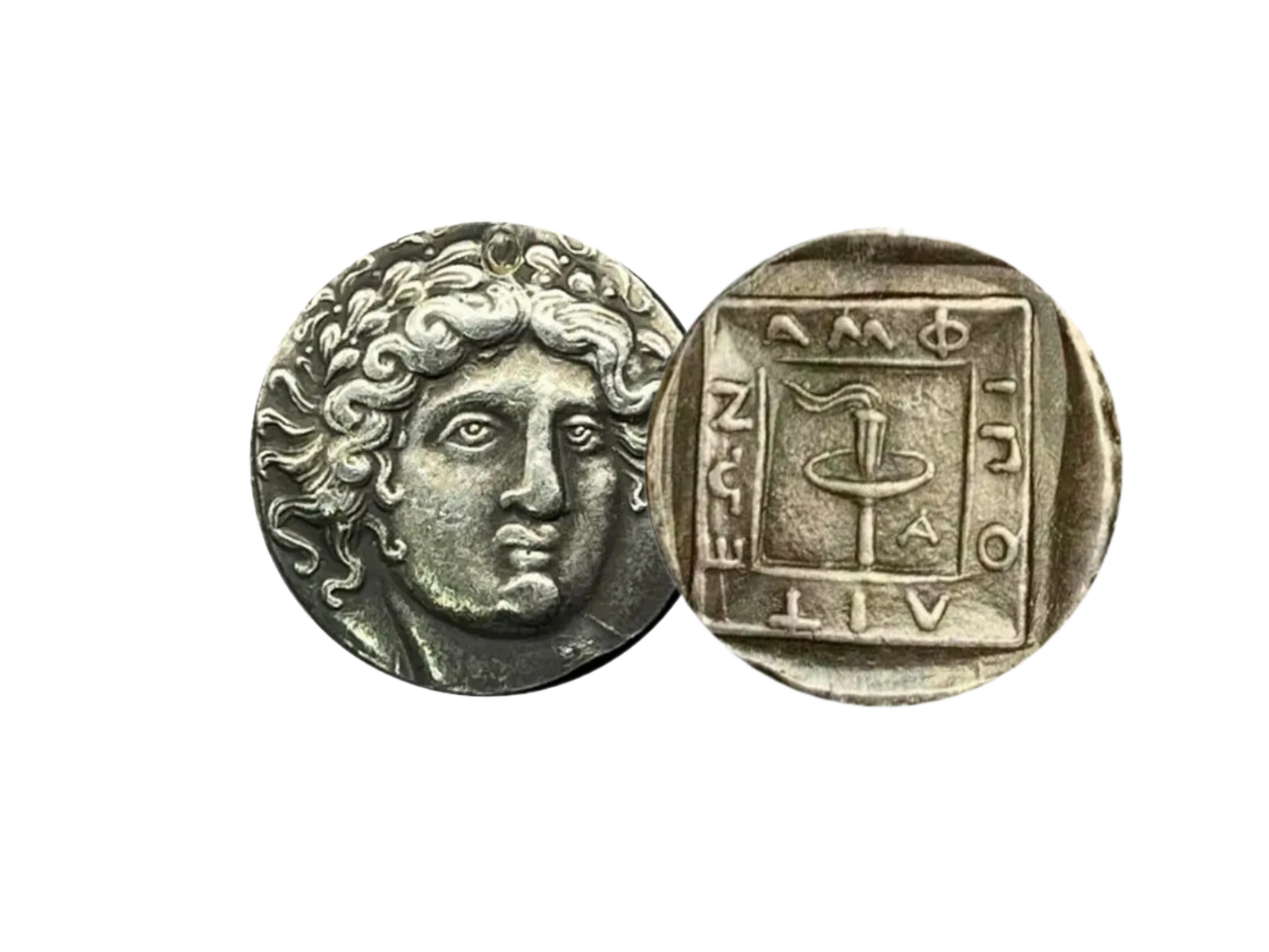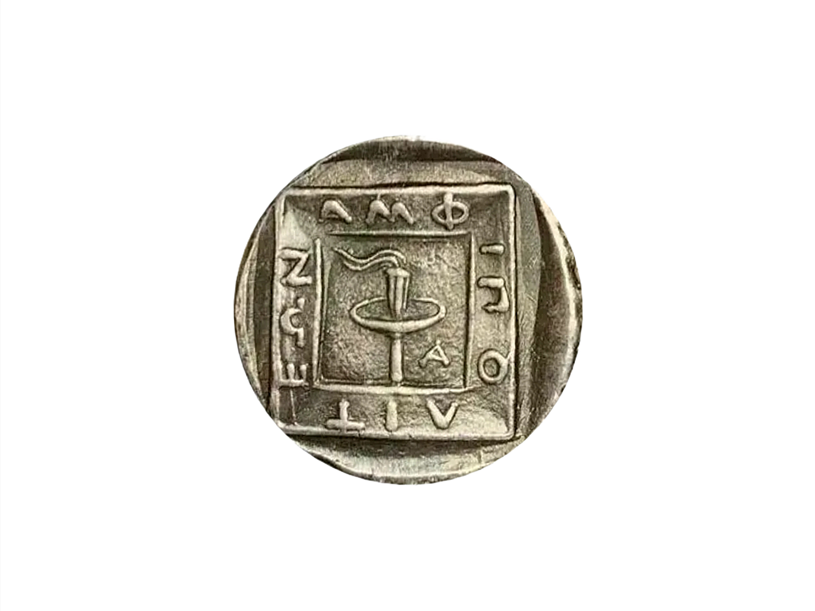 Ancient Greek silver coin known as a tetradrachm from the city of Amphipolis in Macedonia. The reverse (back) depicts a flaming race torch within a linear square, symbolizing athletic competitions. The inscription around the torch reads "AMΦIΠOΛITEΩN" (of the Amphipolitans).