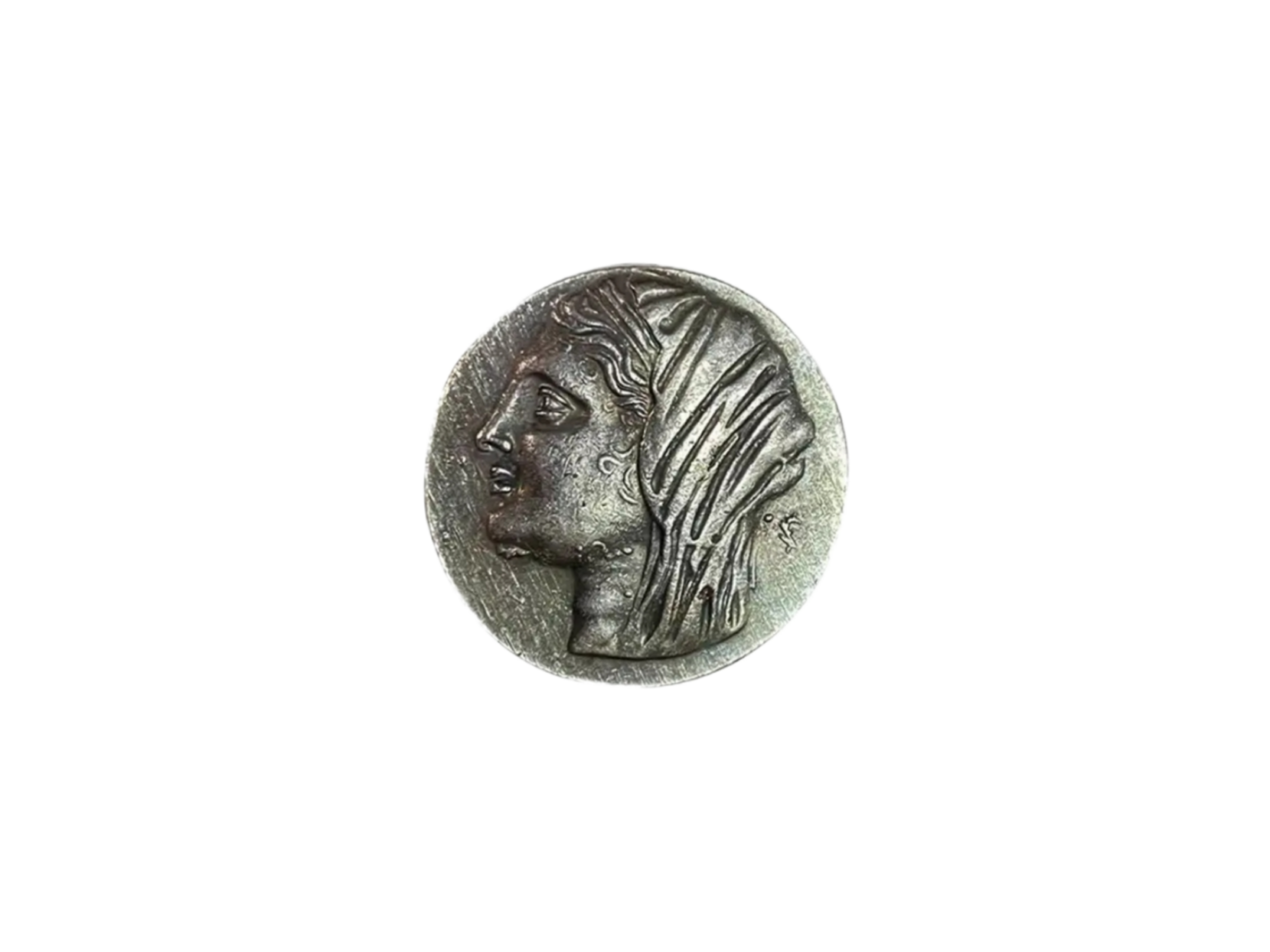 Philistis was one of the few real women, as opposed to goddesses, to be depicted on a Sicilian coin. She was the wife of Hieron II, a tyrant king of ancient Syracuse. The coin was minted between 274 and 216 BC. The obverse (front) of the coin depicts the veiled and diademed head of Queen Philistis. The reverse (back) depicts the Greek goddess of victory, Nike, driving a quadriga (a four-horse chariot).